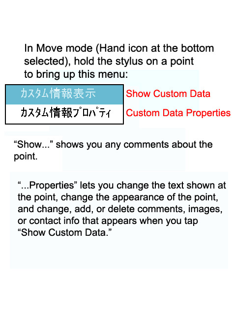 Move mode (hand icon). Mapple is always in either Move, Rotate, or Point modes, according to which of those icons at the bottom of the screen is selected. When the Move/Hand icon is selected, then dragging the stylus or a finger on the map moves the map (note that if the GPS is connected, the map will almost immediately snap back to your current position). When in Move mode, holding the stylus on a point of interest you've created brings up a pop-up menu offering the choice of viewing or editing the point and any comments, data, or images attached to it. Top, Mapple 10 Index